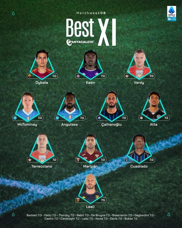 北京时间10月27日,意甲官方公布联赛第8轮的最佳阵容,恰尔汗奥卢、麦克托米奈、迪巴拉、瓦尔迪入选。